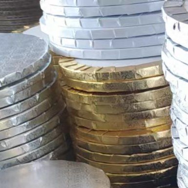 Cake drums are 1/2″ thick heavy cardboard covered in embossed foil.